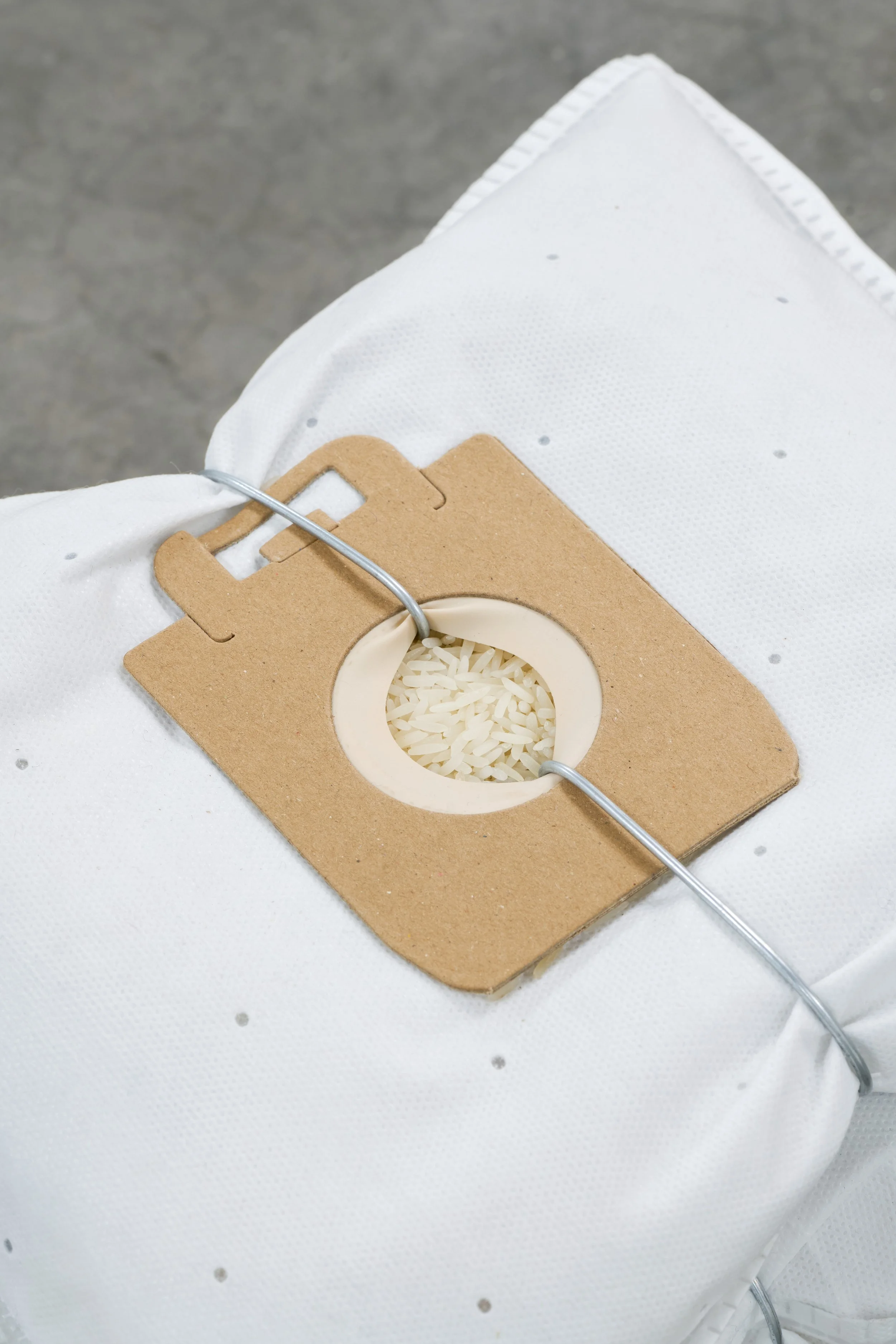 The work consists of vacuum bags, rice and steel